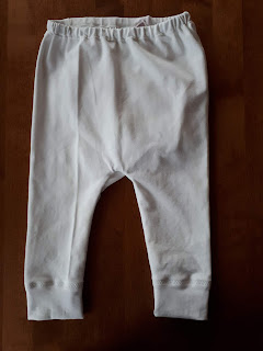 Ompelin aprikoosin väriset housut koossa 62cm. Itseasiassa tässä kävi niin, että leikkasin vahingossa OB:n Ruusunpuna-kaavalla leggarit koossa 56cm, vaikka tarkoitus oli tehdä kokoa isommat. Unohdin ottaa housuista kuvan heti valmistumisen jälkeen ja nyt niissä on jo tahra, joka ei lähde pois... Kuvakin on tosi hämärä. Trikoo on Kangaskapinasta ja resori muistaakseni Nappinjasta.